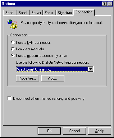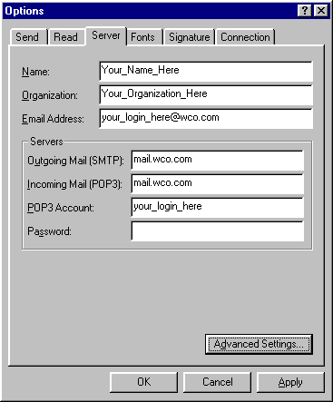 For the Outgoing Mail (SMTP) and the Incoming Mail (POP3), type in mail.wco.com